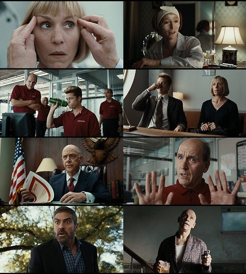 Chad (Brad Pitt) wants a quick payday from what he thinks are "classified documents." He ends up shot in the face by a paranoid George Clooney.